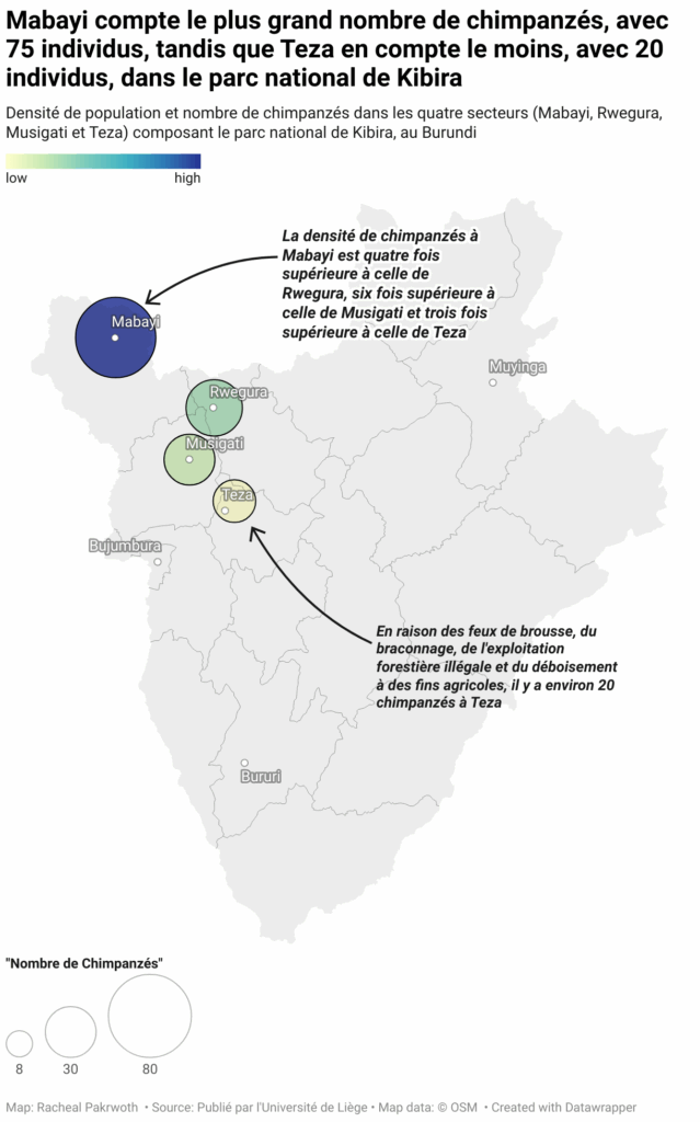 Leur habitat menacé, certains chimpanzés y ont laissé la vie et les rescapés ont déserté les secteurs de la Kibira notamment Rwegura, Teza et Musigati. Ils se sont réfugiés dans le secteur Mabayi directement contigu au National Nyungwe Park (NNP) au Rwanda où ils recherchent la sécurité alimentaire et physique, indique Dismas Hakizimana, chercheur-enseignant à l’université du Burundi et Marie-Claude Huynen, chercheur-enseignant à l’université de Liège dans leur article scientifique « Chimpanzé (Pan troglodytes schweinfurthii), densité et abondance de la population dans le parc national de Kibira, au Burundi » publié par l’université de Liège en 2013.  Ces auteurs indiquent que les chimpanzés sont plus nombreux dans le secteur de Mabayi. Carte