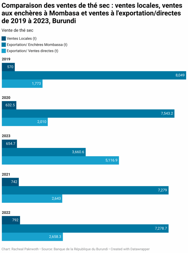 Le thé sec est à l’heure actuelle la seconde culture d’exportation et de source de devises pour le Burundi après le café. La Banque de la République du Burundi indique que plus de 90% de la production du thé sec est exportée. Cette exportation se répartit entre les ventes directes aux grossistes privés et les ventes aux enchères de Mombassa. Les ventes directes représentent 54,2%, soit 5 116,9 tonnes de production de thé. Les ventes aux enchères représentent 38,8% qui équivalent à 3 660,6 tonnes de production de thé. La consommation locale de thé représente 6,94%, ce qui équivaut à 654,7 tonnes.